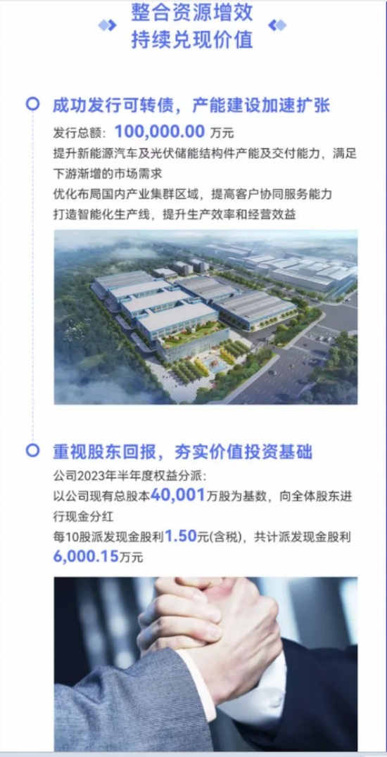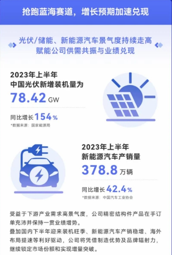 據(jù)了解,銘利達系專業(yè)從事精密結(jié)構(gòu)件及模具的設(shè)計、研發(fā)、生產(chǎn)及銷售,以產(chǎn)品研發(fā)、模具設(shè)計和工藝設(shè)計與創(chuàng)新為核心,以精密壓鑄、精密注塑、型材加工和五金沖壓技術(shù)為基礎(chǔ),為國內(nèi)外優(yōu)質(zhì)客戶提供多類型、一站式的精密結(jié)構(gòu)件產(chǎn)品。 銘利達表示,收益與下游產(chǎn)業(yè)高景氣度,公司精密結(jié)構(gòu)件產(chǎn)品在手訂單充沛并保持一貫業(yè)績增勢。疊加國內(nèi)下半年迎來裝機旺季、新能源汽車產(chǎn)銷穩(wěn)增、海外布局提速等利好驅(qū)動,公司憑借制造優(yōu)勢和品牌輻射力,繼續(xù)鎖定市場份額和實現(xiàn)增量突破。 據(jù)介紹,從涉及行業(yè)來看,公司產(chǎn)品的應(yīng)用領(lǐng)域主要包括光伏、儲能、安防、新能源汽車以及消費電子。其中,光伏、儲能和新能源汽車為清潔能源應(yīng)用領(lǐng)域,預(yù)期未來一段較長的周期都將保持較高的成長性和增長空間,同步將帶動結(jié)構(gòu)件行業(yè)領(lǐng)域的持續(xù)快速發(fā)展。國家能源局數(shù)據(jù),2023年上半年,中國廣泛新增裝機量為78.42GW,同比增長154%。中國汽車工業(yè)協(xié)會數(shù)據(jù)顯示,上半年,新能源汽車產(chǎn)量378.8萬輛,同比增長42.4%。 另外,安防經(jīng)過多年的發(fā)展,目前已處于行業(yè)的成熟期,消費類電子,尤其如加熱不燃燒煙等新型消費品等應(yīng)用領(lǐng)域方興未艾,也處于行業(yè)快速發(fā)展階段。發(fā)揮一站式品牌優(yōu)勢,實現(xiàn)0EM精密結(jié)構(gòu)件代工+自有品牌雙軌發(fā)展。 在產(chǎn)能建設(shè)方面,目前,銘利達在國內(nèi)建成8達生產(chǎn)基地,分布在廣東東莞、肇慶,江西、湖南,重慶,四川,江蘇、安徽等地,保障產(chǎn)品高效供應(yīng)及交付。2023年加速布局海外生產(chǎn)基地,北美墨西哥和歐洲匈牙利基地推進投建。進一步穩(wěn)固海內(nèi)外客戶的合作粘性。