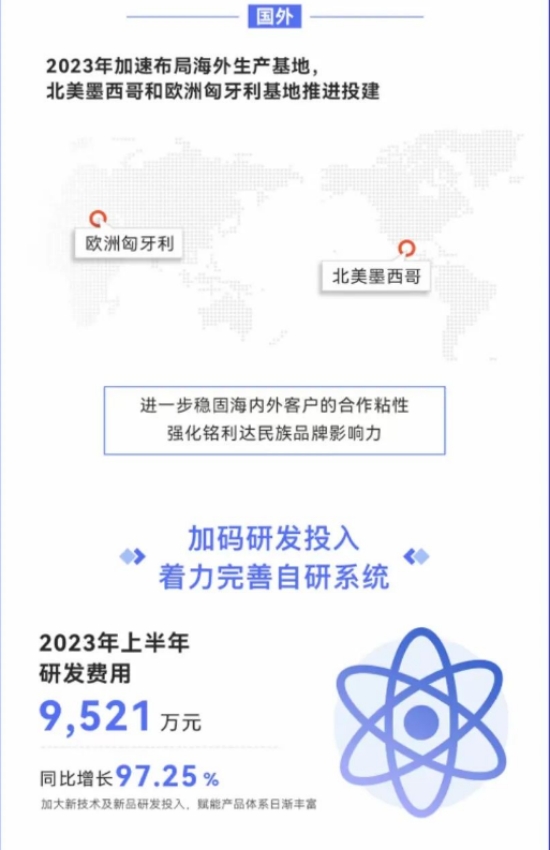 在研發(fā)投入方面,加碼研發(fā)投入,著力完善自研系統(tǒng)。銘利達表示,2023年上半年,研發(fā)費用9521萬元,同比增長97.25%。加大新技術(shù)及新產(chǎn)品研發(fā)投入,賦能產(chǎn)品體系日漸豐富。
