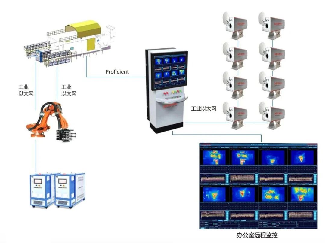 探譜特MTOM專研的紅外實時在線測溫系統便是模溫優化的利器,能實時獲取模具溫度分布的熱像圖,并對溫度數據進行記錄與分析。不僅能對比噴涂前后的模溫變化,也可展示同一模不同區域的模溫差異,以及每個位置不同模次的溫度變化趨勢。同時,模溫實時在線監測系統與壓鑄機控制系統對接,交換數據與控制信號,實現自動控制采集數據,并且還可以與噴涂機器人、模溫機、點冷機等周邊設備通信并完成閉環控制。從而有效監測壓鑄過程中的模具表面溫度與變化情況,為模溫優化提供可靠依據。