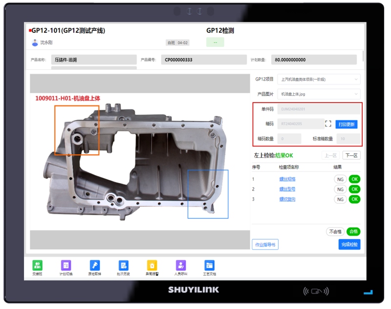 GP12產(chǎn)線終端界面(適用單件產(chǎn)品) 當(dāng)檢測合格數(shù)量達(dá)到產(chǎn)品標(biāo)準(zhǔn)箱數(shù)量時,會自動觸發(fā)箱碼打印,同時支持二次檢驗、不滿箱打印,產(chǎn)品換箱等多種使用場景,基本覆蓋了客戶對GP12系統(tǒng)流程的所有要求。【適用范圍:單件管理的產(chǎn)品】