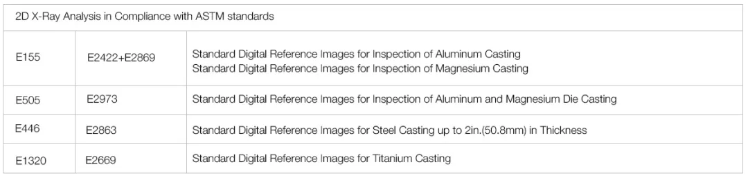 截止今日X-Ray已廣泛的用于鑄件的無損檢測領(lǐng)域,并且根據(jù)不同的應(yīng)用場景及客戶需求演化成了兩派,分別是2D和3D。其中2D檢測由于其成像速度快,能夠做到100%在線全檢,從而得到了各大主機廠及其供應(yīng)商的廣泛應(yīng)用,也催生了相應(yīng)的行業(yè)和企業(yè)標(biāo)準(zhǔn)。其中最被廣泛接受和使用的為ASTM制定的行業(yè)標(biāo)準(zhǔn)和主機廠設(shè)立的企業(yè)標(biāo)準(zhǔn)。