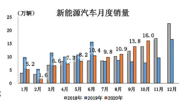 乘用車?yán)^續(xù)保持增長,對整體汽車市場的增長貢獻(xiàn)高于商用車,且好于上月,乘用車中SUV、交叉型乘用車?yán)^續(xù)快速增長;商用車在貨車、客車的拉動下,依然呈現(xiàn)大幅增長,銷量第7次刷新當(dāng)月的歷史記錄,其中重、輕、微型貨車銷量也均創(chuàng)下當(dāng)月的歷史新高。新能源市場表現(xiàn)突出,本月銷量呈現(xiàn)大幅度增長,實現(xiàn)本年度第4 次刷新當(dāng)月歷史記錄,累計銷量降幅明顯收窄。出口市場開始呈現(xiàn)恢復(fù)態(tài)勢,繼9月汽車出口增速由負(fù)轉(zhuǎn)正后,本月繼續(xù)保持增長。 乘用車產(chǎn)銷同比繼續(xù)保持增長 10月,乘用車產(chǎn)銷分別完成208.4萬輛和211.0萬輛,環(huán)比分別增長1.6%和0.8%,同比分別增長7.3%和9.3%。從細(xì)分車型來看,除MPV車型外,其他3類車型產(chǎn)銷均呈現(xiàn)同比增長。 1-10月,乘用車產(chǎn)銷分別完成1531.6萬輛和1549.5萬輛,同比分別下降10.1%和9.9%,降幅較1-9月繼續(xù)收窄2.3和2.5個百分點。從細(xì)分車型來看,SUV和交叉型乘用車好于總體水平,其中轎車產(chǎn)銷同比分別下降14.1%和13.6%;SUV產(chǎn)銷同比分別下降2.7%和3.1%;MPV產(chǎn)銷同比分別下降31.2%和29.5%;交叉型乘用車產(chǎn)銷同比分別下降 5.9%和4.6%。 商用車產(chǎn)銷同比繼續(xù)保持大幅增長 10月,商用車產(chǎn)銷分別完成46.8萬輛和46.4萬輛,環(huán)比分別下降2.2%和2.8%;同比分別增長 30.9%和30.1%。細(xì)分車型銷量來看,客車、貨車呈現(xiàn)增長,其中貨車今年第7次刷新當(dāng)月歷史記錄。貨車分車型來看,重型、輕型、微型貨車也均刷新當(dāng)月歷史銷量記錄。客車分車型來看,輕型客車增長貢獻(xiàn)明顯。 1-10月,商用車產(chǎn)銷分別完成420.3萬輛和420.4萬輛,同比分別增長22.5%和20.9%,增幅較1-9月繼續(xù)擴大1和1.1個百分點。分車型產(chǎn)銷情況看,客車產(chǎn)銷分別下降5.2%和6.6%;貨車產(chǎn)銷分別增長25.7%和24.1%。 新能源汽車產(chǎn)銷同比大幅增長 10月,新能源汽車產(chǎn)銷分別完成16.7萬輛和16萬輛,同比分別增長69.7%和104.5%,其單月產(chǎn)銷第四次刷新了當(dāng)月歷史記錄。從細(xì)分能源類型來看,其中純電動汽車產(chǎn)銷分別完成14.1萬輛和13.3萬輛,同比分別增長72.4%和115.4%;插電式混合動力汽車產(chǎn)銷分別完成2.6萬輛和2.7萬輛,同比分別增長56.7%和63.7%;燃料電池汽車產(chǎn)銷分別完成77輛和79輛,同比分別增長1.3%和4.0%。