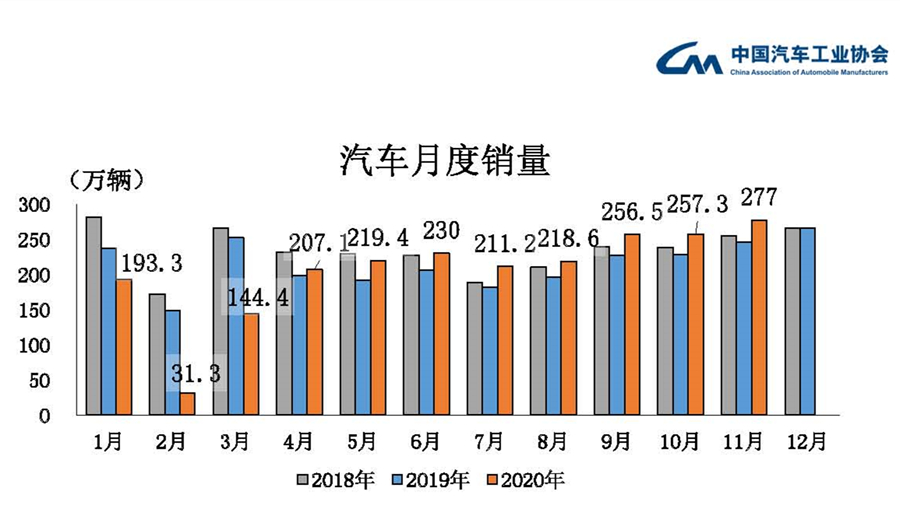 ![]() 壓鑄周刊(2020年12月14日 北京)12月11日,中國汽車工業(yè)協(xié)會在北京發(fā)布11月汽車工業(yè)經(jīng)濟(jì)運行數(shù)據(jù)。11月,汽車產(chǎn)銷分別完成284.7萬輛和277.0萬輛,環(huán)比分別增長11.5%和7.6%,同比分別增長9.6%和12.6%。截至本月,汽車產(chǎn)銷已連續(xù)8個月呈現(xiàn)增長,其中銷量已連續(xù)7個月增速保持在10%以上。 11月,擴(kuò)大內(nèi)需戰(zhàn)略以及各項促進(jìn)消費政策持續(xù)發(fā)力,國內(nèi)統(tǒng)籌推進(jìn)疫情防控和經(jīng)濟(jì)社會發(fā)展工作成效明顯。汽車產(chǎn)銷同比繼續(xù)保持增長,行業(yè)形勢呈現(xiàn)穩(wěn)中有進(jìn)的態(tài)勢。新能源汽車市場表現(xiàn)突出,本月銷量呈現(xiàn)大幅度增長,實現(xiàn)本年度第5次刷新當(dāng)月歷史記錄,累計銷量增速已由負(fù)轉(zhuǎn)正。出口市場延續(xù)了9月份以來的恢復(fù)態(tài)勢,本月出口創(chuàng)歷史新高。 汽車產(chǎn)銷同比繼續(xù)保持快速增長 11月,汽車產(chǎn)銷延續(xù)了增長勢頭,產(chǎn)銷量均創(chuàng)年內(nèi)新高,分別達(dá)到284.7萬輛和277萬輛,環(huán)比增長11.5%和7.6%,同比增長9.6%和12.6%。1-11月,汽車產(chǎn)銷分別為2237.2萬輛和2247萬輛,同比下降3%和2.9%,降幅與1-10月相比,分別收窄1.6個百分點和1.8個百分點。