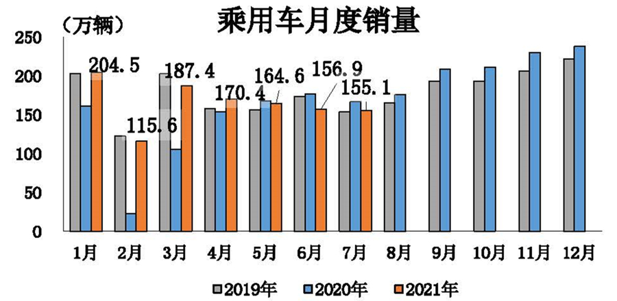 乘用車產銷降幅有所收窄 7月,乘用車產銷分別完成154.8萬輛和155.1萬輛,環比分別下降0.5%和1.1%,同比分別下降10.7%和7%,降幅比6月分別收窄3和4.1個百分點。1-7月,乘用車產銷分別完成1139.4萬輛和1156萬輛,同比分別增長20.1%和21.2%。