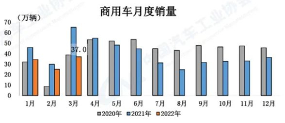 商用車產(chǎn)銷同比明顯下降 3月,商用車產(chǎn)銷分別完成36萬輛和37萬輛,環(huán)比分別增長29.2%和47.7%,同比分別下降38%和43.5%。1-3月,商用車產(chǎn)銷分別完成98.5萬輛和96.5萬輛,同比分別下降29.7%和31.7%。