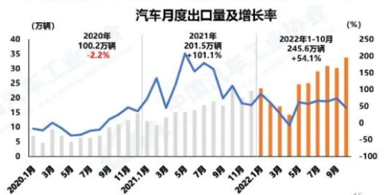 汽車出口創新高 10月,汽車企業出口創歷史新高,達到33.7萬輛,環比增長12.3%,同比增長46%。1-10月,汽車企業出口245.6萬輛,同比增長54.1%。分車型看,乘用車出口197.5萬輛,同比增長57.1%;商用車出口48萬輛,同比增長43%;新能源汽車出口49.9萬輛,同比增長96.7%。