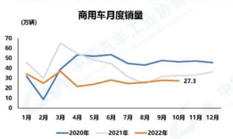 商用車市場仍處于低位徘徊態勢 10月,商用車產銷分別完成26.5萬輛和27.3萬輛,產量環比增長0.8%,銷量環比下降1.8%;同比分別下降22.7%和16.2%。1-10月,商用車產銷分別完成269.1萬輛和275.7萬輛,同比分別下降31.7%和32.8%。