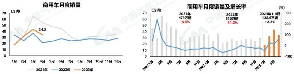 商用車市場復蘇不及預期 4月,商用車產銷分別完成35.5萬輛和34.8萬輛,環比分別下降18.4%和19.9%,同比分別增長68.8%和60.5%。1-4月,商用車產銷分別完成130.3萬輛和128.6萬輛,同比均增長8.8%。