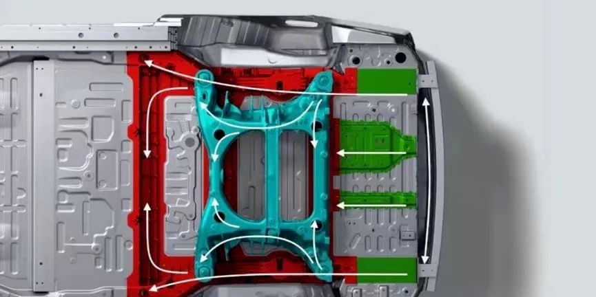 之后在2023年,發布了車身中段一體式壓鑄結構,將其中段一體式壓鑄結構稱為“蜻蜓結構”,使用7200T的壓鑄機,使得整體減少了16個部件、66個連接點,整車減重7%,座椅安裝點剛度平均提升18%,具有可變延伸設計。