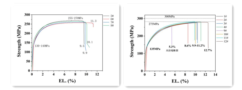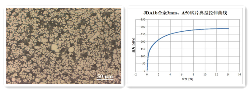 表1. JDA1b不同模具溫度、真空度、澆口速度、壓鑄溫度下材料的流動距離 b、以合金組織控制為出發(fā)點(diǎn)(圖1),創(chuàng)新性引入微量元素對組織進(jìn)行變質(zhì)、細(xì)化,確保合金組織細(xì)小,彌散,保證合金強(qiáng)度與塑性。綜合考慮免熱處理性能、鑄造性能及壓鑄工藝性等,鑄態(tài)下材料達(dá)到屈服130-150MPa,抗拉260-300MPa,延伸率12-15%的力學(xué)性能(圖2);