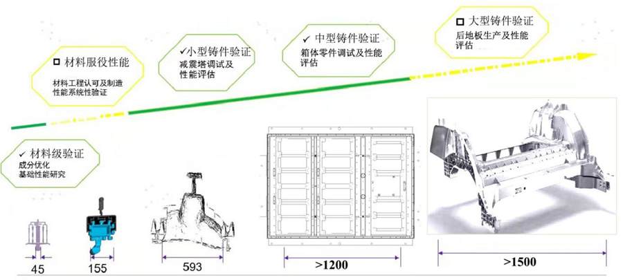 圖3. JDA1b合金減震塔 b、JDA1b合金一體化超大鑄件: 近日,上海交通大學(xué)輕合金國家工程中心與華人運(yùn)通高合汽車共同研發(fā)的TechCastTM低碳鋁合金材料一體化超大壓鑄件正式獲得量產(chǎn)應(yīng)用。TechCastTM正是結(jié)合JDA1b合金特性與華人運(yùn)通一體化超大鑄件特點(diǎn)優(yōu)化獲得的免熱處理壓鑄鋁合金。經(jīng)過多輪研發(fā)攻關(guān)和零件驗(yàn)證,在材料開發(fā)、性能優(yōu)化、制造工藝和系統(tǒng)集成驗(yàn)證等方面實(shí)現(xiàn)了100%全流程正向開發(fā),在材料壓鑄性能、力學(xué)性能、制造性能、環(huán)境耐久性能等指標(biāo)上表現(xiàn)優(yōu)異。該材料流動性高于同級別材料15%以上、強(qiáng)塑積高出30%以上,保證了整車碰撞等性能達(dá)到更高維度。