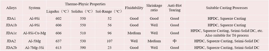 圖4. JDA1b合金超大一體化鑄件應(yīng)用驗(yàn)證流程 彭立明團(tuán)隊(duì)其他免熱處理壓鑄鋁合金材料 經(jīng)過多年開發(fā)、積累,上海交通大學(xué)輕合金中心丁文江院士、彭立明教授團(tuán)隊(duì),已成功開發(fā)2種合金體系5個(gè)亞型的免熱處理壓鑄鋁合金材料,滿足不同性能與應(yīng)用場景需求。其中JDA1x是Al-Si-X系、JDA2x是Al-Mg-X體系。五種合金力學(xué)性能如下表2所示。從表中合金性能對比可以發(fā)下,JDA壓鑄鋁合金材料在鑄態(tài)下即可達(dá)到優(yōu)異的力學(xué)性能,滿足不同應(yīng)用場景下零部件的性能要求。表3為JDA合金部分鑄造性能參數(shù)。