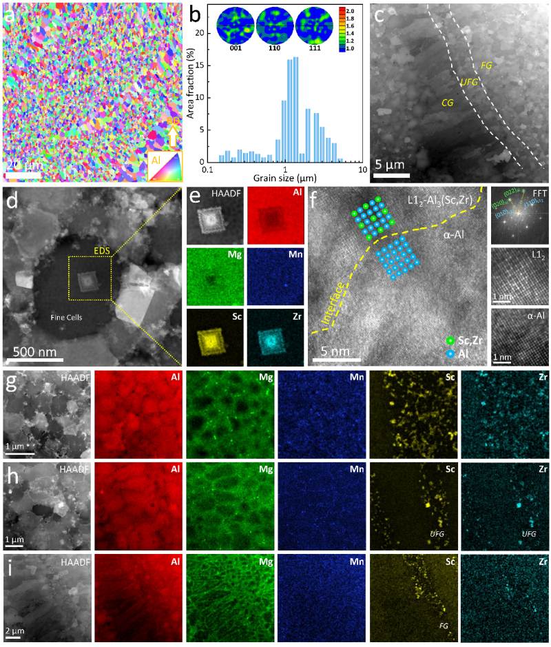 圖1 打印態鋁合金中具有三模態晶粒分布的分級異質結構圖 針對上述問題,朱強與其合作者提出了一種通過增材制造技術制備具有超細異質結構與納米尺度面缺陷強化的Al-Mg-Mn-Sc-Zr合金材料,其兼具超高強度與高塑性。研究表明打印態鋁合金展示出三模態晶粒分布的分層異質結構:超細等軸晶,細等軸晶與細小柱狀晶,主要是由于Al3(Sc,Zr)顆粒的不均勻析出而形成。進一步的微觀組織表征還發現納米尺度的面缺陷,包括高密度的層錯、孿晶界與9R相。打印態的合金展示出優異的力學性能,包括屈服強度~461 MPa,延伸率~21%。為進一步增幅沉淀強化效果,課題組采用直接時效熱處理(300攝氏度下4小時)促進大量納米強化相的析出。同時,打印態組織中的納米級面缺陷和三模態晶粒異質結構在熱處理后也得以保留,這成就了超高強度與優異塑性的結合。熱處理態合金~656MPa的屈服強度超過了之前報道的幾乎所有增材制造高強鋁合金與鍛造鋁合金。