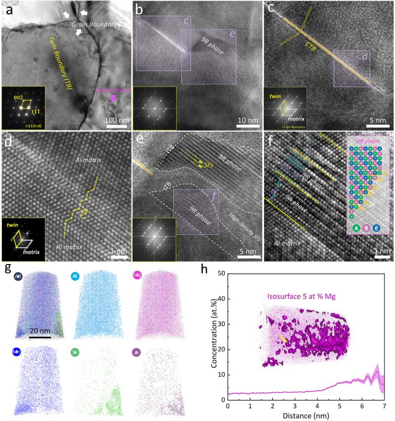![]() 近日,南方科技大學機械與能源工程系講席教授朱強團隊與香港城市大學呂堅院士團隊、北京科技大學毛新平院士團隊、澳大利亞昆士蘭大學張明星教授團隊合作,在增材制造(3D打印)鋁合金領域取得新進展,相關成果以“Additively manufactured fine-grained ultrahigh-strength bulk aluminum alloys with nanostructured strengthening defects”為題發表在學術期刊 Materials Today 上。 該研究表明通過激光粉末床熔融(L-PBF)增材制造技術,可促使鋁合金同時具備細化的多模態晶粒異質結構與納米尺度的面缺陷(如層錯,孿晶界,9R相),以此優化材料力學性能,使其屈服強度達到迄今為止幾乎所有L-PBF生產的鋁合金中最高水平(~656 MPa),并同時具有可觀的延伸率(~7.2%)。該類高強韌鋁合金的成功研發為用于先進結構應用的高性能鋁合金部件提供了新的范式,有利于輕量化設計和減少碳足跡。 金屬增材制造技術作為一種先進的材料成形工藝,為復雜結構零部件設計與成型及高性能合金的設計與開發提供了新的機遇。在雙碳約束與加快發展新質生產力戰略的背景下,市場對產品輕質高強化的需求與標準不斷提高。因此,具有優異力學性能的輕質鋁合金復雜結構零部件受到了航空航天、汽車工業和國防工業等領域的廣泛關注。目前,大多數鋁合金的金屬增材制造局限于近共晶的鋁硅成分(如AlSi10Mg),雖然這些成分容易加工,但力學性能較差。而具有最佳性能的沉淀硬化鋁合金(如2xxx或7xxx系列)由于凝固溫度區間大,在打印過程的極端凝固條件下極易發生熱裂現象,從而難以制備。朱強團隊與其他團隊之前的研究均表明,通過原位形成或外部引入與鋁基體晶格匹配的異質形核顆粒,和/或含有高生長限制因子(即高Q值)的有效溶質,可以在打印過程中引發顯著的晶粒細化與消除裂紋。然而,這些鋁合金在強度和延展性之間難以實現令人滿意的平衡,對打印鋁合金的更廣泛的商業部署與工業應用帶來了挑戰。 近期,材料學界在開發高性能金屬材料取得的突破揭示了引入納米級強化面缺陷(如孿晶邊界,層錯,9R相)以提高力學性能的變革潛力。以納米孿晶為例,其作為一種特殊的微觀組織可為金屬材料帶來諸如高強度、高穩定性等優異的性能,一直是行業內的研究熱點。但迄今為止,相關研究大多局限于具有中、低層錯能的金屬材料(如銅和銀等),在具有高層錯能的金屬(如鋁)中則很難形成納米孿晶組織。 對于工業上廣泛使用的鋁及鋁合金而言,如果能形成這些納米級的面缺陷進行強化,則有望大幅度提高其強度,從而擴寬其應用范圍。通常而言,將鋁與低層錯能金屬(如鐵,銀,鎂等)復合,可以在超快速凝固條件下(如物理氣相沉積)形成具有納米孿晶的鋁基薄膜。這種制備方法工藝復雜、條件嚴苛,同時需要利用低層錯能金屬作為孿晶源以誘發孿晶生長且僅能制備薄膜材料。對于塊狀材料而言,目前主要通過嚴重塑性變形來引入這些納米尺度的面缺陷進行強化,其實際應用則受到限制。因此,如何能在更加簡單的條件下直接制備出納米面缺陷強化的塊狀鋁材料仍是國際性難題,相關研究具有重要的理論意義與實用價值。