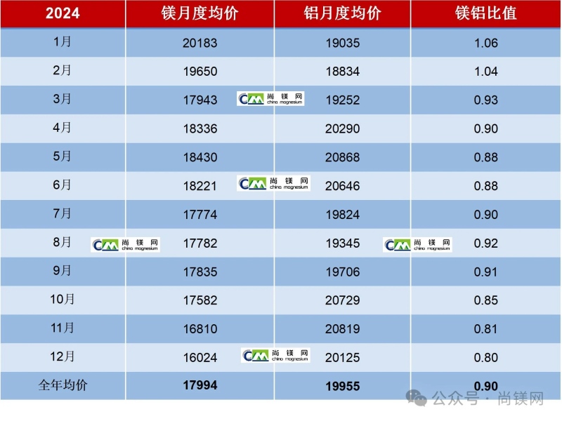 可以說,目前鎂價已經超跌,鎂鋁比值已經低于公認的合理區間,鎂冶煉廠普遍處于虧損狀態。但是另一方面,鎂鋁比值的回歸,鎂的性價比再度凸顯,是有利于鎂合金應用的重要信號。2025年,預計鎂鋁比值仍然會保持在合理區間,相關產業鏈人士應該重新樹立鎂市場穩定供應的信心。 2024年中國鎂錠與鋁錠月度平均價及鋁鎂比值(元/噸)