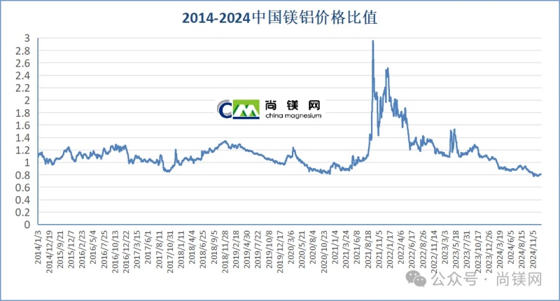 在2024年3月4日,國內鎂價格開始低于鋁價,其后鎂鋁價格走勢完全相反,鎂跌鋁漲,價差開始逐步拉大,鎂鋁比值持續下降。全年的近10個月時間里,鎂價格與鋁價格的比值都在1.0以下,11月中旬最低達到過0.78,當時鎂價低于鋁價4880元。年底收盤時鎂鋁比值為0.81,鎂價顯著低于鋁價3760元。