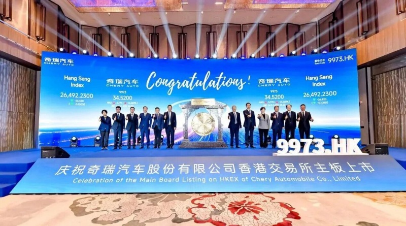 圖源:深交所 聯合動力是深圳市匯川技術股份有限公司(簡稱“匯川技術”)的控股子公司,作為匯川技術新能源汽車板塊的運營主體,聯合動力于2009年進入新能源汽車零部件領域,專注于新能源汽車電機、電控、電源及動力總成等產品的研發、生產與銷售。2025年上半年,公司營收91.48億元,同比增長51%;凈利潤為5.49億元,同比增長92.91%。 奇瑞汽車在港交所掛牌上市 2025年9月25日,奇瑞汽車股份有限公司(股票代碼:9973.HK)在香港聯合交易所主板正式掛牌上市。奇瑞此次港股IPO全球發售2.97億股H股(綠鞋前),募集資金總額約91.45億港元,成為2025年迄今港股規模最大的車企IPO。