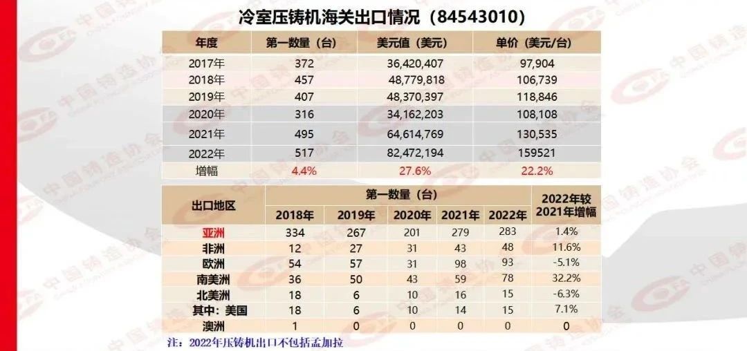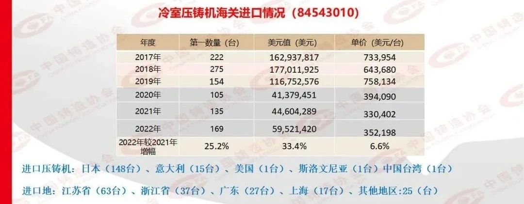 2022年中國鑄造行業海關進出口數據顯示,冷室壓鑄機出口517臺,同比增長4.4%;冷室壓鑄機進口169臺,同比增長25.2%。其中,進口壓鑄機中,日本148臺,意大利15臺,美國1臺,斯洛文尼亞1臺,中國臺灣1臺。
