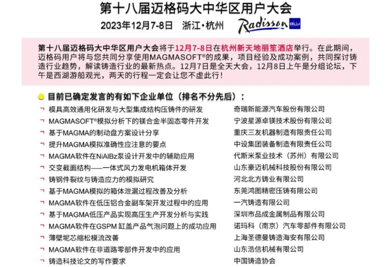 ![]() 渤海汽車鋁制結(jié)構(gòu)件產(chǎn)品輻射亞歐美等國家和地區(qū) 近日,渤海汽車系統(tǒng)股份有限公司(簡稱:渤海汽車)在互動平臺表示,公司積極開拓海外市場,公司的活塞、輪轂及鋁制結(jié)構(gòu)件等產(chǎn)品已輻射亞洲、歐洲、美洲等多個國家和地區(qū)。 渤海汽車成立于1999年,主要從事活塞及組件、輕量化汽車零部件、汽車輪轂、減震器等多個產(chǎn)品的設計、開發(fā)、制造及銷售。2022年,渤海汽車完成對渤海特銳邁特汽車控股有限公司(簡稱:BTAH)的100%股權(quán)收購。BTAH公司是歐洲知名的汽車輕量化鋁合金部件研發(fā)和制造企業(yè),在鋁合金材料(包括免熱處理材料)開發(fā)、產(chǎn)品結(jié)構(gòu)設計、高壓鑄造先進工藝開發(fā)、模具設計及制作等核心能力方面積累了豐富的經(jīng)驗,產(chǎn)品涵蓋傳統(tǒng)動力總成部件、新能源三電系統(tǒng)及車身結(jié)構(gòu)件等。 第十八屆邁格碼大中華區(qū)用戶大會本周舉行 2023年第十八屆邁格碼大中華區(qū)用戶大會,將于2023年12月7-8日在浙江杭州新天地麗笙酒店舉行。屆時,邁格碼與用戶將共同分享使用MAGMASOFT的成果、項目經(jīng)驗以及成功案例,共同探討鑄造行業(yè)趨勢,解讀鑄造行業(yè)的最新熱點。12月7日是全天大會,12月8日上午是分組論壇。