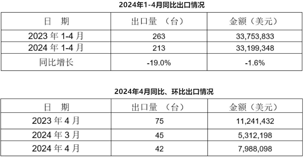 AAA Sales & Engineering成立于1968年,自2021年被聯誠精密收購后,業務穩步增長。2024年4月,聯誠美國銷售額達到350萬美元,同比增長25%。公司預計2024年全年銷售額將達到3600萬美元。由于公司業務量的增長,原有廠房產能逐漸飽和,因此公司已在租用其他公司的廠房來解決產能問題。 1-4月我國冷室壓鑄機出口213臺 來自中國鑄造協會的消息,根據海關數據統計,2024年1-4月,我國冷室壓鑄機共計出口213臺,同比下降19%。其中4月冷室壓鑄機出口42臺,同比下降44%,環比下降6.7%。