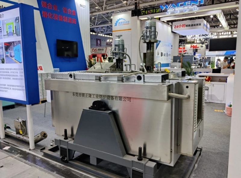 ![]() 鎂正隆參展主要核心團隊 2023年11月27-30日,2023 DMP大灣區工博會暨國際(深圳)鑄業展,在深圳國際博覽中心隆重舉行。在壓鑄及鑄造館,160余家產業鏈上下游知名企業現場展示創新產品、技術、應用及解決方案。 鎂正隆:推介更高定量精度的鎂合金定量爐 在本屆展會上,東莞市鎂正隆工業熔爐設備有限公司/安徽鎂正隆科技有限公司(簡稱:鎂正隆)現場展示一臺型號為MD500鎂合金自動定量爐,可以配套350T-500T鎂合金壓鑄機。據了解,MD系列鎂合金定量爐具有定量精度高、節能環保、維護簡易、使用壽命長等優點,擁有配套200T-9000T壓鑄機的各種型號產品,并已為安徽某知名鎂合金壓鑄企業提供配套7000T壓鑄機的定量爐。 據介紹,鎂正隆MD系列鎂合金自動定量爐,采用雙泵結構,定量精準,料餅穩定,相比傳統單泵結構壓鑄產品良品率提高30%左右、節約原材料10%以上。進口西門子PLC智能控制,遠程實時監控跟蹤,有效控制誤操作及參數修正,大大提高生產效率。瞬時定量澆鑄功能,壓鑄周期短、品質高。爐膛及傳輸管采用PID加熱控制,更節能、更環保、使用壽命長。