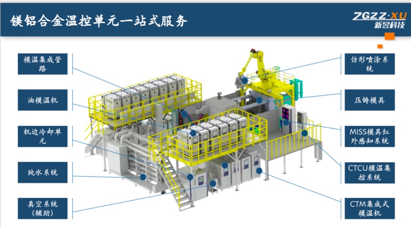 鎂鋁合金溫控單元一站式服務解決方案 寧波新昱智能科技有限公司始終專注于鎂鋁合金壓鑄車身熱管理系統領域。公司所有溫控設備均為自主研發,亦是國內市場上溫控設備產品線最齊全的企業之一。憑借對壓鑄行業的深耕,公司將整套溫控系統與模具設計、壓鑄工藝、仿形噴涂及真空輔助技術深度融合,打造大型智能化溫控單元一站式服務,致力于解決壓鑄汽車零部件在生產中面臨的良品率低、效率低、節拍慢、成本高等問題。