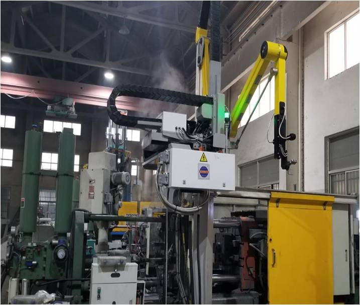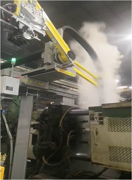 圖2:KRES系列噴取一體機(jī)在客戶工廠應(yīng)用 同樣由于Z軸采用了連桿機(jī)構(gòu),產(chǎn)品取出后直接被送至壓鑄機(jī)安全門以外的地方待機(jī),這時噴霧產(chǎn)生的高溫高濕的氣體不會對鑄件質(zhì)量產(chǎn)生影響(見下圖2)。此外,高強度的連桿手臂可在后期實現(xiàn)多功能的拓展,例如:可實現(xiàn)鑄件水冷,去渣包,切邊等功能。