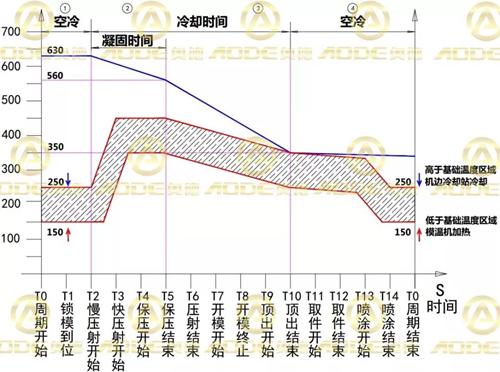 使用模溫機(jī),點(diǎn)冷機(jī)的具體優(yōu)點(diǎn)如下: 【1】預(yù)熱模具,減小開始生產(chǎn)時(shí)的模具面層與內(nèi)部溫度梯度,防止模具因溫度異常導(dǎo)致開裂而失效。 【2】預(yù)熱模具和保持模具在生產(chǎn)初始和生產(chǎn)間隙的溫度,減少熱模時(shí)間,節(jié)約能耗,加快生產(chǎn)的進(jìn)度,提高效率。 【3】生產(chǎn)過程中模具溫度保持恒定(加熱、冷卻),可使壓鑄件尺寸,密度保持穩(wěn)定,保證產(chǎn)品質(zhì)量的穩(wěn)定性。 【4】由于模溫機(jī)的加熱冷卻作用,可減少脫模劑的使用量,減少對(duì)模具的激冷,從而減少熱應(yīng)力的產(chǎn)生,延緩模具表面龜裂的產(chǎn)生,從而延長(zhǎng)模具的使用壽命。 【5】可以減少冷卻水的使用,延長(zhǎng)模具壽命,節(jié)省壓鑄周期,對(duì)產(chǎn)品粘模、粘鋁和拉傷也有一定的抑制作用,提高產(chǎn)品的外觀,降低不良品的產(chǎn)生。 【6】有效冷卻,控制凝固時(shí)間,解決產(chǎn)品縮孔。 【7】合理的控制整個(gè)壓鑄周期的模具溫度,幫助實(shí)現(xiàn)微噴。 壓鑄件凝固/模具冷卻時(shí)間示意圖