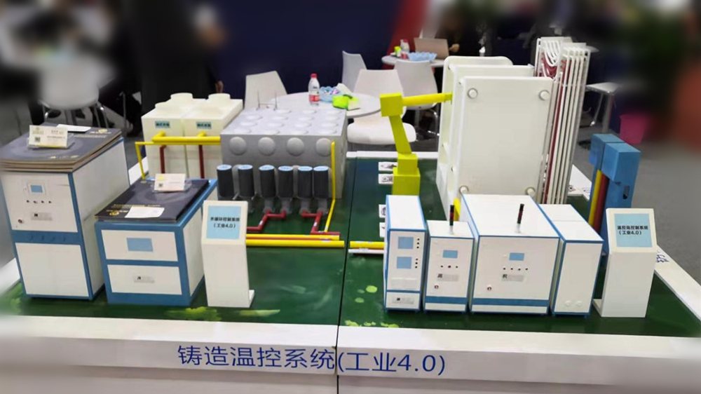 基于工業(yè)4.0的鑄造溫控系統(tǒng) “鑄造(壓鑄)溫控系統(tǒng)”為壓鑄車間溫度控制,由壓鑄專用模溫機、壓鑄專用油溫機,高壓模冷機、高壓點冷機,模具表面清洗機、模具管路清洗機,冷水機,純水機,熱成像儀,加熱器,水箱等單元構成,由控制軟件串聯(lián)成一個龐大的壓鑄車間循環(huán)溫控系統(tǒng),實現(xiàn)壓鑄過程中的模具熱平衡,以達到降低壓鑄件缺陷、提升品質的效果。 在溫控設備方面,奧德機械集中展示了壓鑄專用模溫機,高溫水溫機,以及油循環(huán)溫度控制機和水循環(huán)溫度控制機。