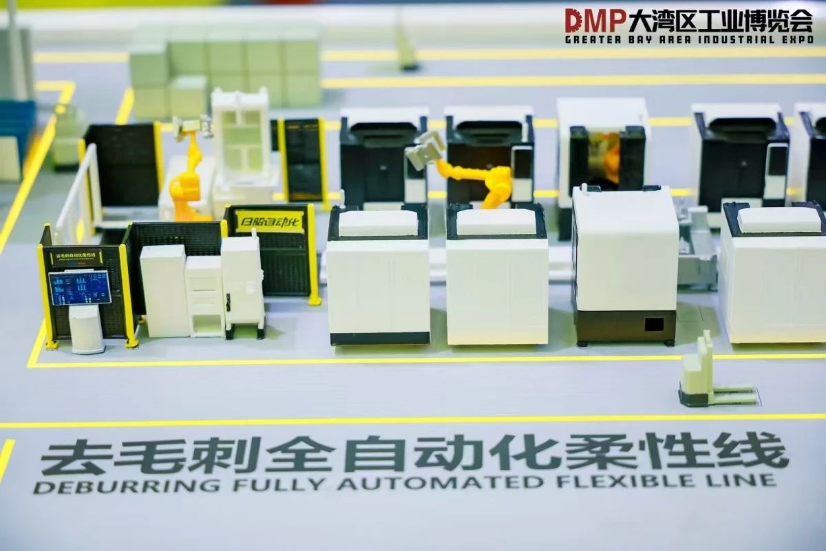 日昭自動(dòng)化展示的去毛刺自動(dòng)化柔性線模型 據(jù)悉,日昭自動(dòng)化的復(fù)合型去毛刺打磨拋光一體工作站,巧妙結(jié)合了六軸去毛刺專機(jī)與機(jī)器人打磨拋光兩種技術(shù),形成了一套能夠提供一站式毛刺去除和打磨拋光服務(wù)的智能化解決方案。整機(jī)采用全工序流水式布局,最多可同時(shí)裝載16種清理打磨工具,工作過程中無需翻轉(zhuǎn)、中轉(zhuǎn)或等待,單機(jī)工作效率是傳統(tǒng)設(shè)備的1.5-2倍,人工成本節(jié)約可達(dá)50%。