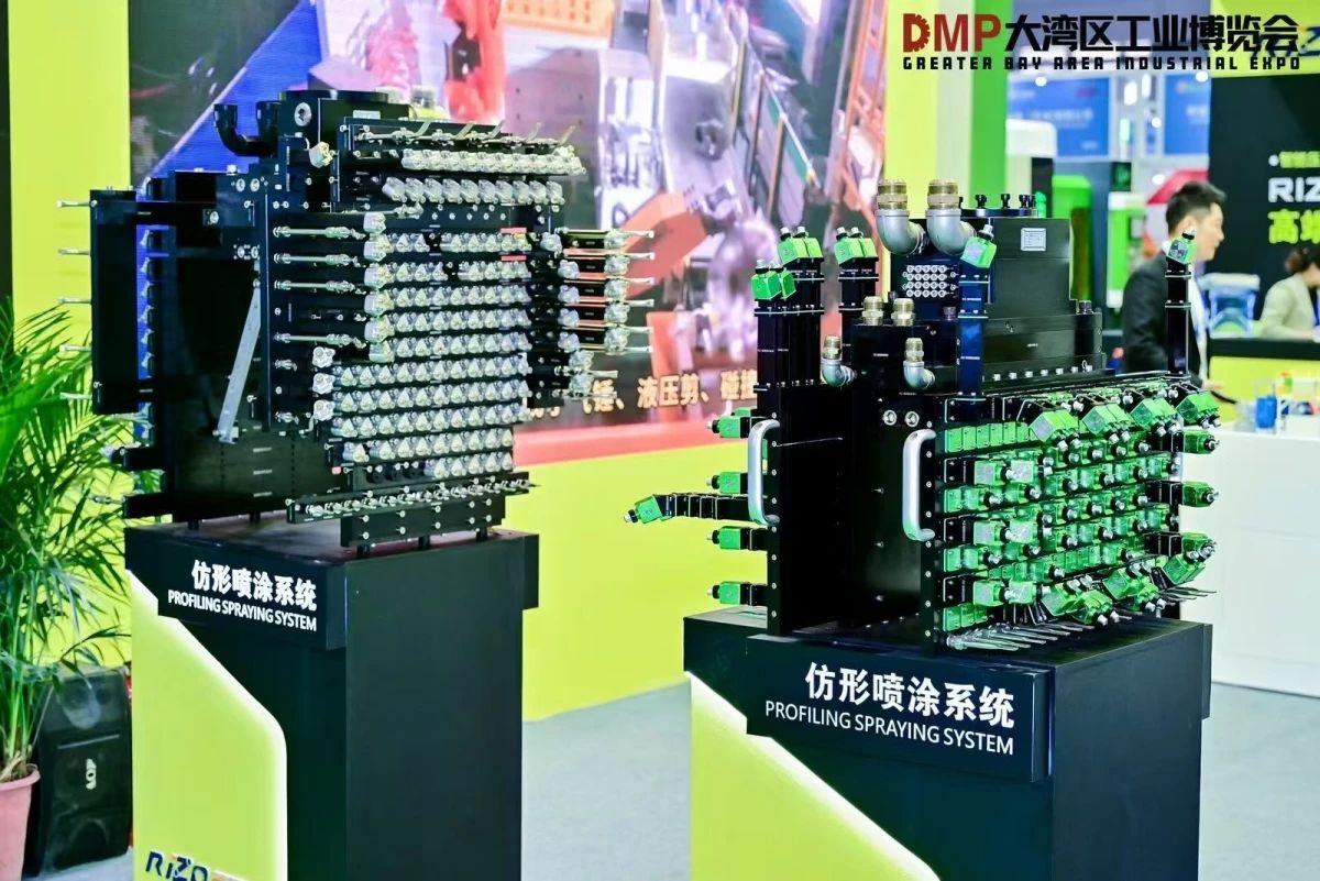 日昭自動(dòng)化技術(shù)人員為用戶介紹產(chǎn)品 據(jù)了解,日昭壓鑄島仿形噴涂系統(tǒng)根據(jù)模具形狀和熱成像溫度監(jiān)測(cè)進(jìn)行深度仿形設(shè)計(jì),模塊可以組合成斜角、垂直角等各種角度模塊,以實(shí)現(xiàn)對(duì)抽芯及滑塊等的仿形噴涂。模板內(nèi)置控制系統(tǒng),能夠快速且零延遲地切換噴嘴,以及控制主氣、吹氣等管路。同時(shí),采用了全新的噴涂技術(shù),大幅降低了脫模劑的損耗和縮短了噴涂時(shí)間,減少了污水處理成本,提高了模具的壽命。