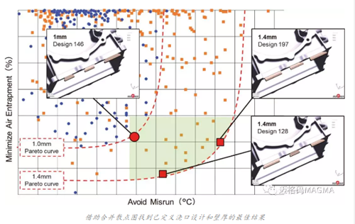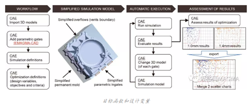 在第二步,他們在 MAGMASOFT®中定義了優化過程的評估目標和關鍵質量標準。在豐田汽車公司的這個案例中,從產品質量方面來說,最重要的目標就是要避免出現澆不足并減少鑄造卷氣現象。為了縮短準備時間和計算時間,他們根據邁格碼六步法簡化了模擬模型。 通過使用 MAGMASOFT®散點圖對虛擬試驗進行系統評估和比較之后,我們可以清楚地看出能夠實現定義的壁厚和內澆口設計的合適解決方案。通過使用統計方法對所有變量進行定量比較,可以得出不受主觀影響的可靠結果。