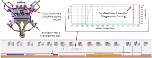 圖17:通過“評估區域”擴展模擬模型,以便有針對性地評估關鍵鑄造區域。連接節點目標過程的壓射性質包括充型結束時的大幅度沖頭減速,以避免毛邊。 |