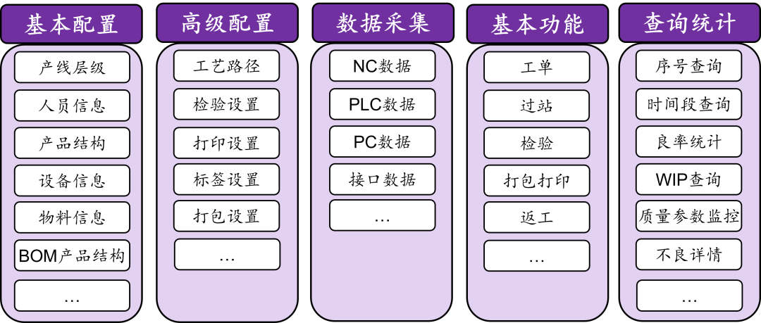 •制造執(zhí)行系統(tǒng)(MES),包括:生產(chǎn)管理(PMS)、設備管理(TPM)、追溯管理(TMS)、刀具管理(TLM)、模具管理(DLM)及倉儲管理(WMS)等,