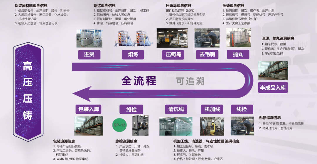 摘要:壓鑄行業(yè),尤其是汽車壓鑄件,行業(yè)對鑄件品質(zhì)要求日益增長,在質(zhì)量管控要求、參數(shù)清單、壓鑄布局等情況下,都對企業(yè)全過程追溯提出了要求。全過程追溯系統(tǒng)是對生產(chǎn)數(shù)據(jù)、工藝數(shù)據(jù)、人員和質(zhì)量數(shù)據(jù)的采集和大數(shù)據(jù)分析,進行精確的產(chǎn)品質(zhì)量批次追溯。根據(jù)企業(yè)在全過程追溯管理方面的需求,結(jié)合工藝流程重點及關注點,為企業(yè)從進貨、熔化、精煉、壓鑄、清理、拋丸、機加工、清洗、氣密性檢測、二次清洗和包裝等關鍵節(jié)點進行數(shù)據(jù)采集以完成全流程追溯。通過全過程追溯系統(tǒng),實現(xiàn)工廠的數(shù)字化、智能化。