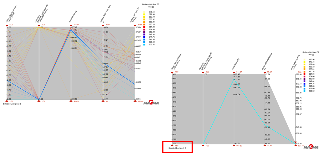 圖4 壓鑄工藝參數優化設計圖 圖5為自主優化的模擬結果。圖5a中每一條彩色線段為一組工藝參數方案,共5個豎軸,從左至右分為高速變化區間,壓射方案變化區間,成型溫度結果范圍,內澆口速度范圍和熱節時間范圍。通過拖動每個豎軸上下兩端的箭頭來獲得最佳的工藝方案,例如想要最低熱節時間,往下拖動豎軸上端箭頭,最后得到最小的熱節時間為方案1,同時方案1的成型溫度也較高,內澆口速度相對較低。圖5b左豎軸為熱節時間范圍,右豎軸為成型溫度結果范圍,下橫軸為全部工藝方案,通過觀察溫度和熱節時間的變化曲線,可以發現方案1的成型溫度相對較高,熱節時間最短。圖5c最上一排為熱節時間根據不同方案和高速速度的變化規律,第二排為內澆口速度根據不同方案和高速速度的變化規律,第三排為成型溫度根據不同方案和高速速度的變化規律,右一豎排為高速速度的變化范圍,右二豎排為幾何方案的變化范圍,以熱節時間結果為例,該結果時間變長隨著從方案一切換到方案二,同時其總體趨勢隨著高速速度的提升而變長,所以通過觀察其變化規律,從而抓出最準確的方案與工藝參數。綜合以上所述,在保證成型溫度的基礎上,采用相對較低的壓射速度并配合壓射方案一,可以獲得最小的熱節時間,通過減小熱節時間,從而降低實際生產中所出現的凝固收縮類缺陷。