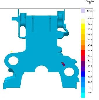 圖3:縮松的MAGMA模擬結果 缺陷描述 缸體鑄件的平衡軸孔處的截面結構如圖1所示,當用X光做全身探傷檢測時,發現有些鑄件在平衡軸孔的側上方有小的縮松(如圖2),通過MAGMASOFT®做數值模擬,可以看到此處有產生縮松的傾向(如圖3),模擬結果和使用虛擬試驗設計DoE(Design of Experiment)優化參數。 使用虛擬試驗設計DoE(Design of Experiment) 優化參數 解決縮松問題,通常從減小缺陷位置的熱節大小或者加強熱節周邊對它的補縮兩方面考慮?;贛AGMASOFT®已經可以模擬出這個缺陷,那么我們通過不同參數組合后,對比模擬結果,就可以比較出更優化的方案。 通過分析鑄件結構和模具內加熱和冷卻系統的分布,對鋁液的溫度,側模加熱的溫度,底模加熱的溫度,側模冷卻開啟時機,底模冷卻的開啟時機等參數進行試驗設計DoE(Design of Experiment),共生成了72組模擬方案。將所有的72組模擬方案排序:可以看到第36組的參數組合所產生的縮松體積最小(如圖4)。