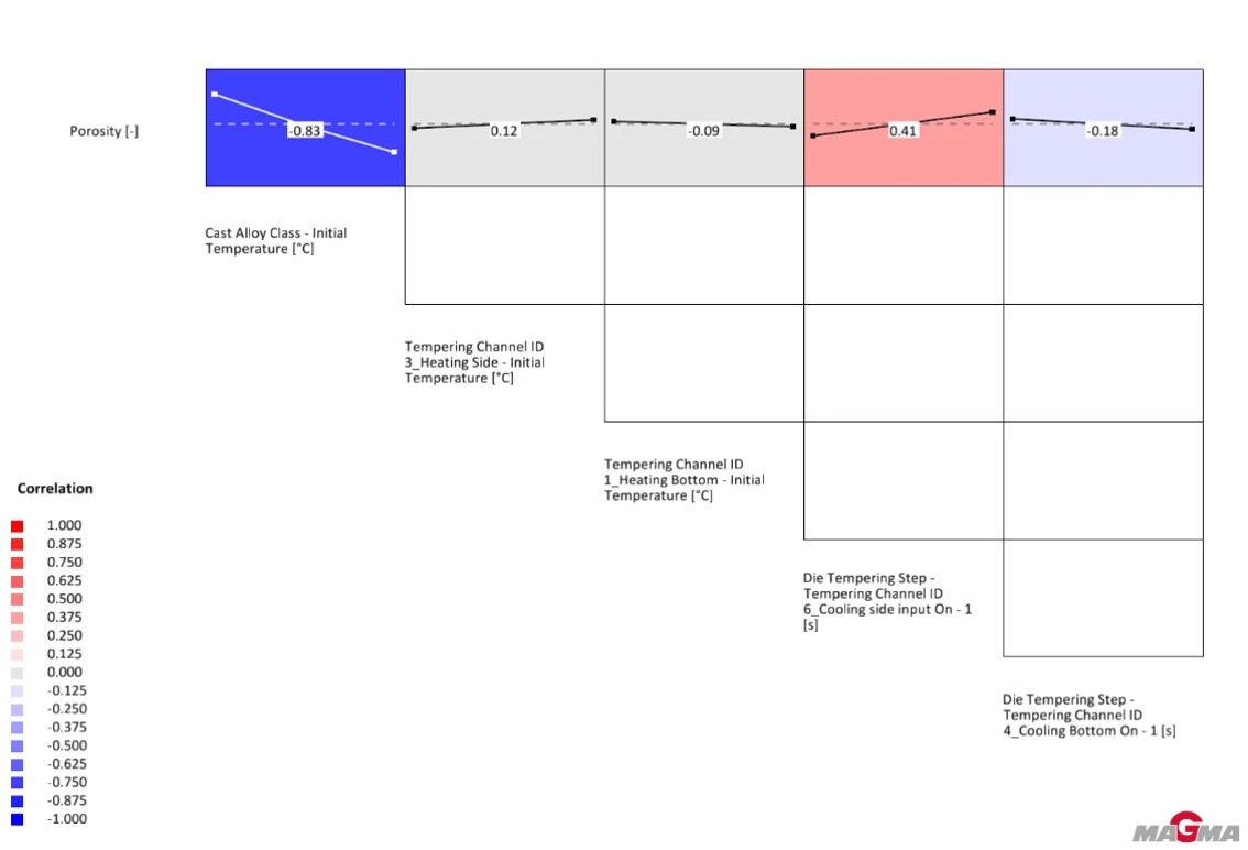 從DoE的相關矩陣圖(圖5)可以看出: 將底模冷卻開啟時間延后,冷卻時長縮短,充型的鋁液在經過底模時溫降較小,補縮能力更強,會使縮松減小,但是影響不大。