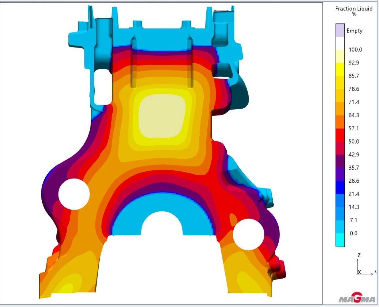 圖6:凝固后期的液相分數結果 在生產驗證時,考慮適當減少后續的加工量,砂芯強度等因素,并且觀察到當直徑改為28mm時,模擬出的縮松體積減小到原體積的約1/3,實際生產時極有可能沒有缺陷或者缺陷符合標準要求。于是先測試了直徑變為28mm的方案,并且相應地調整粗加工的程序,把增厚的材料加工掉。經過批量生產驗證,并100%檢查,所有測試件都無此缺陷。