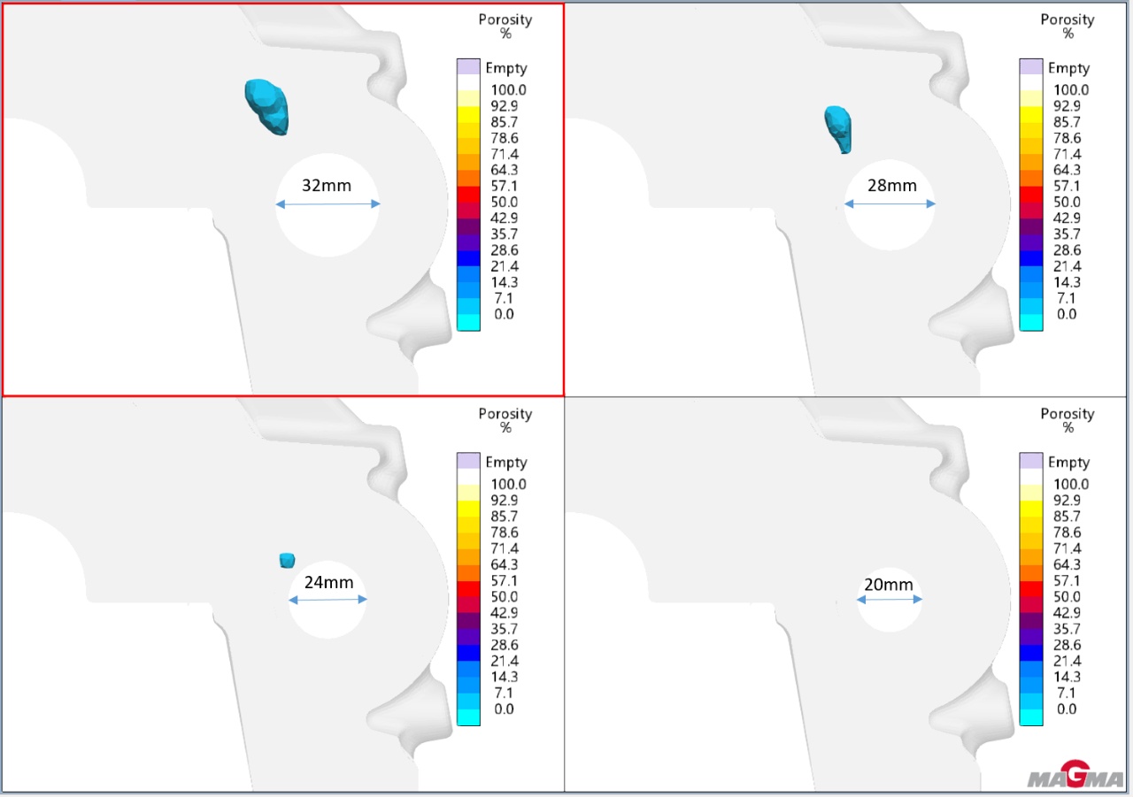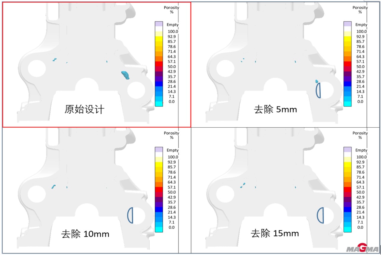 圖5:相關矩陣圖 基于上述結果及分析,我們將參數調整的重點放在鋁液溫度和加強側模中間的冷卻上。通過生產驗證,并且綜合了不同參數下的力學性能,我們確定澆注溫度730℃,側模冷卻從鋁液上升到澆口處立即開啟,冷卻200s的方案。經過批量生產驗證,將該縮松導致的報廢在原基礎上減少約50%。 應用MAGMASOFT®的幾何體交換功能輔助結構優化 由鑄件凝固過程的液相分數結果可以看出,縮松區域在凝固過程中會形成孤立的液相區,從側上部對該部位補縮的通道比較狹長,從下部澆口到該部位的補縮通道會較短,但是因為通道狹窄導致凝固后期補縮中斷。如果能拓寬從澆口到孤立液相區的通道,那么充分利用低壓鑄造時液態金屬在壓力作用下可自下而上地補縮鑄件的條件,可以減小甚至避免缺陷產生。 由于平衡軸孔后續會進行加工考慮把此處的砂芯尺寸變小,增加鑄件的厚度。使用MAGMASOFT®的幾何體交換功能,模擬如圖7所示的方案A。將平衡軸孔處的砂芯,沿水平的直徑方向向右側去除5mm、10mm和15mm。從模擬結果看,隨著補縮通道的加寬,縮松變小直至消除,也沒有發現周邊其他可能被影響到的區域有任何新的缺陷產生。證明了這個思路是正確的。但是這個方案在粗加工時會引起刀具受力不均,可能會對刀具造成損傷。于是又模擬了方案B, 將平衡軸孔處的砂芯直徑整體進行調整。分別模擬從36.5mm減小到32mm,28mm,24mm,20mm的充型凝固過程。從模擬結果可以看出,隨著平衡軸孔直徑的縮小,補縮通道越來越寬,縮松越來越小。到20mm時縮松已經完全消除。