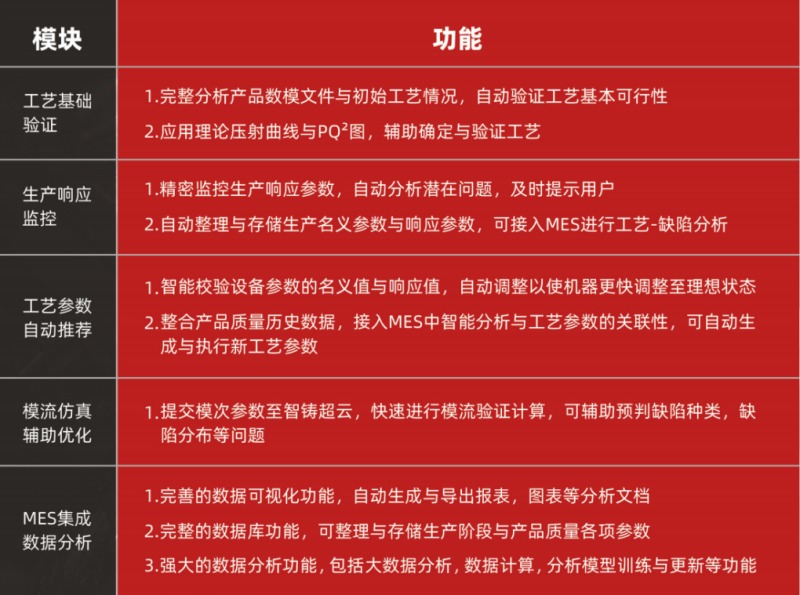 項目以打造智能制造L4等級的透明化、敏捷化、智能化工廠為目標,實現(xiàn)全車間操作決策自動化,以數(shù)字化工廠為基礎,基于數(shù)值仿真技術(shù)建立經(jīng)驗模型、通過深度學習技術(shù)建立修正模型,實現(xiàn)降低廢品率,支持穩(wěn)定生產(chǎn)并降低能耗。實現(xiàn)生產(chǎn)監(jiān)控、零件追蹤、設備預維護、模溫監(jiān)控、工藝參數(shù)監(jiān)控、缺陷分析、智能決策分析及APP&大屏可視化等全流程的自判斷與自決策。預計實現(xiàn)成效: 項目核心版塊包括:自主優(yōu)化工藝參數(shù)的壓鑄智能工藝系統(tǒng),實時監(jiān)控、反饋及調(diào)節(jié)的智能模溫控制系統(tǒng),在線無人化質(zhì)量檢測與分析系統(tǒng),超快速仿真預測及分析系統(tǒng),以及可視化共享、實時診斷的設備生命周期管理系統(tǒng)。 01.智能工藝系統(tǒng) 壓鑄智能車間首個核心功能即智能工藝系統(tǒng),可自動生成生產(chǎn)工藝窗口及建議的優(yōu)化工藝參數(shù),并協(xié)同周邊如真空、噴涂、保溫爐等設備對后續(xù)生產(chǎn)中的工藝參數(shù)進行實時的反饋調(diào)節(jié),實現(xiàn)質(zhì)量閉環(huán)反饋控制,保證穩(wěn)定生產(chǎn)。