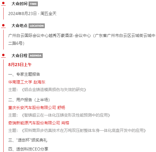 同期活動:適創用戶大會 作為大賽的主辦單位,也作為大賽指定模流分析軟件供應商,適創科技是自主仿真軟件的代表,也始終致力于為中國壓鑄和模具行業的發展貢獻力量,就在8月23日同一地點,適創科技將舉辦2024第二屆用戶大會,共同見證“適創杯”冠軍的誕生,同時我們將匯集行業的頂尖專家、企業代表和適創模流軟件的深度用戶,進行一次前瞻的、深刻的、創新的研討和交流,為推動壓鑄行業的高質量發展注入強大動力,共同見證行業的創新發展和變革圖景!